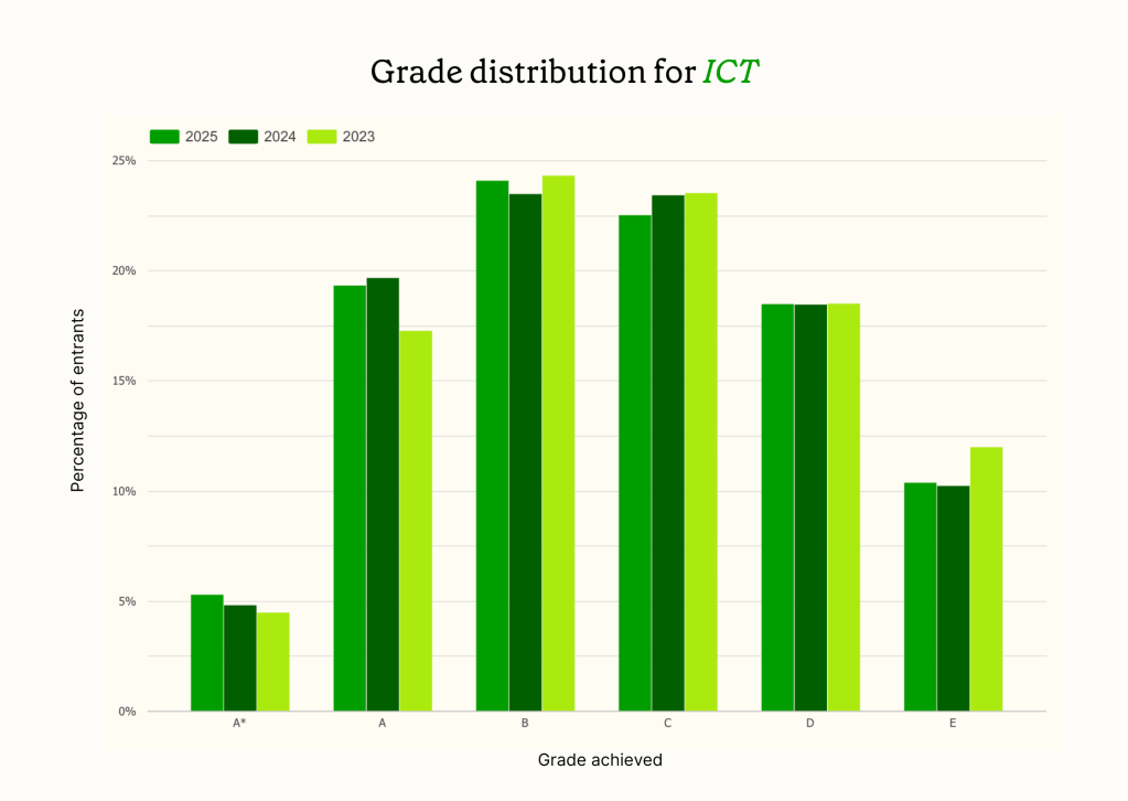 Results in ICT have been largely stable. A*-A grades have risen from 21.8% in 2023 to 24.6% in 2025.