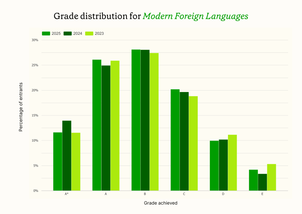 A*-C pass rates have increased from 80.5% to 83.2% over the same period. B remains the most common grade, making up around a third of all results. E grades have dropped from 5.7% in 2023 to 3.8% in 2025.